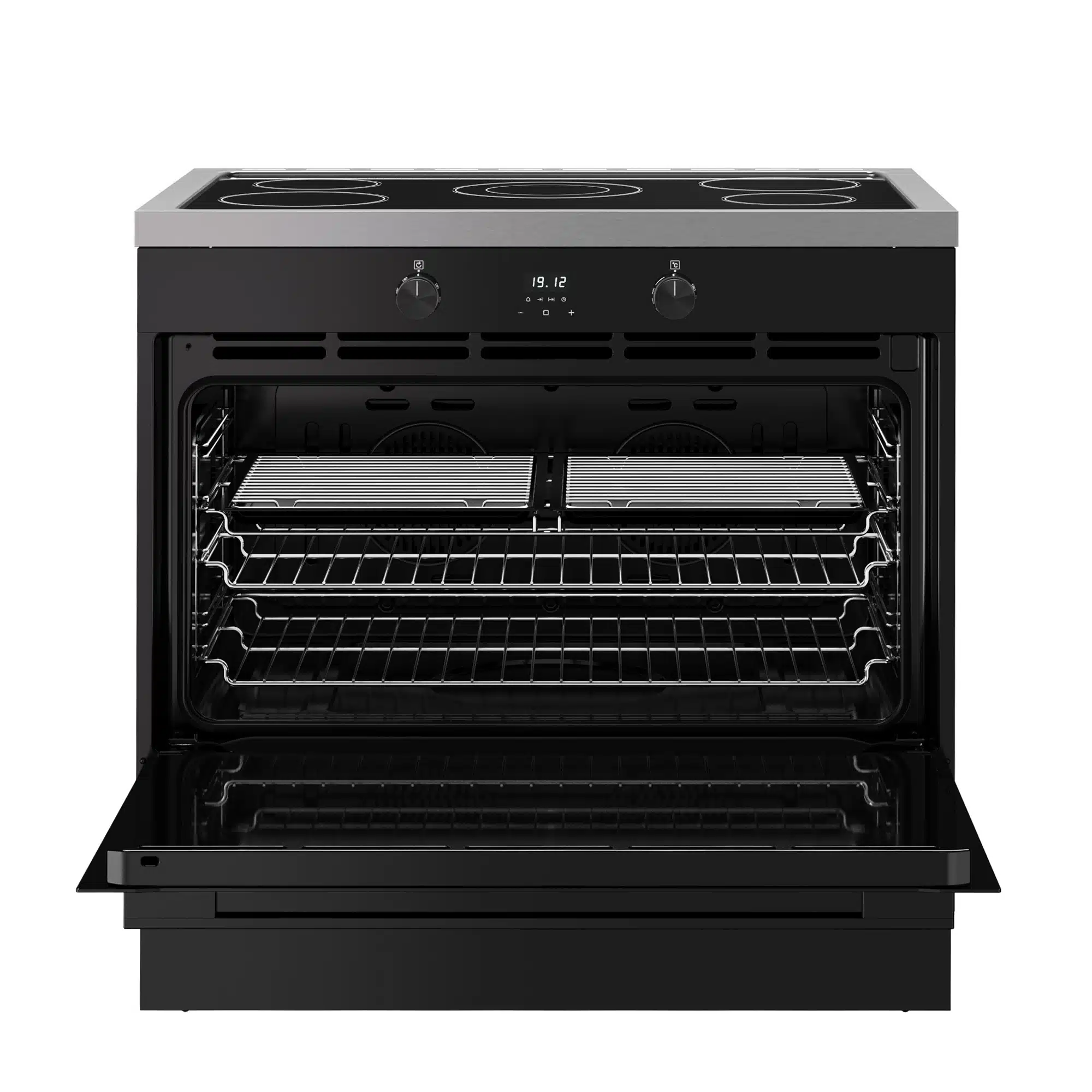 90 cm breed, energieklasse A / A, 5 inductie kookzones, elektronische timer, geforceerde koeling, aansluitwaarde 10,1 kW, afmeting fornuis (b x d x h) 900 x 600 x 880/935 mm.