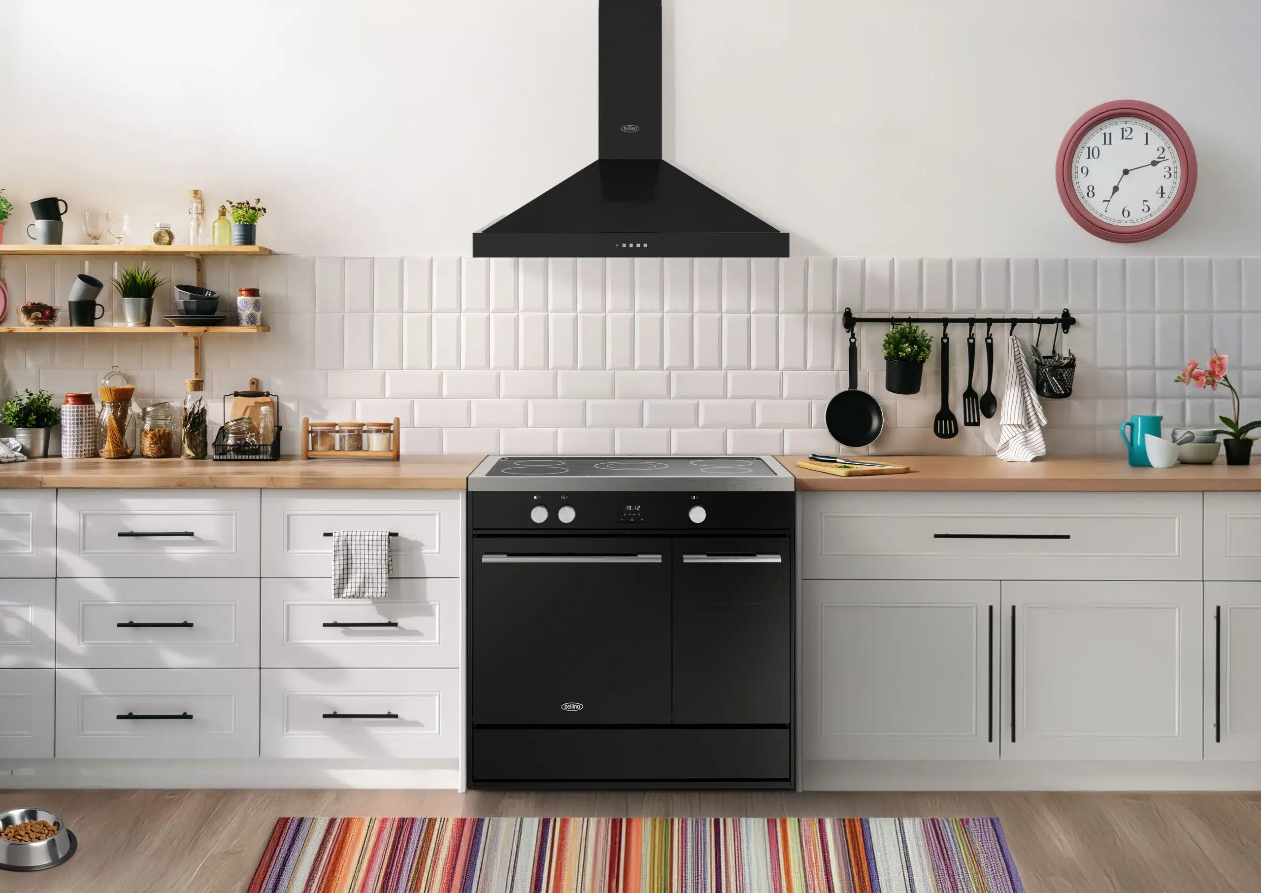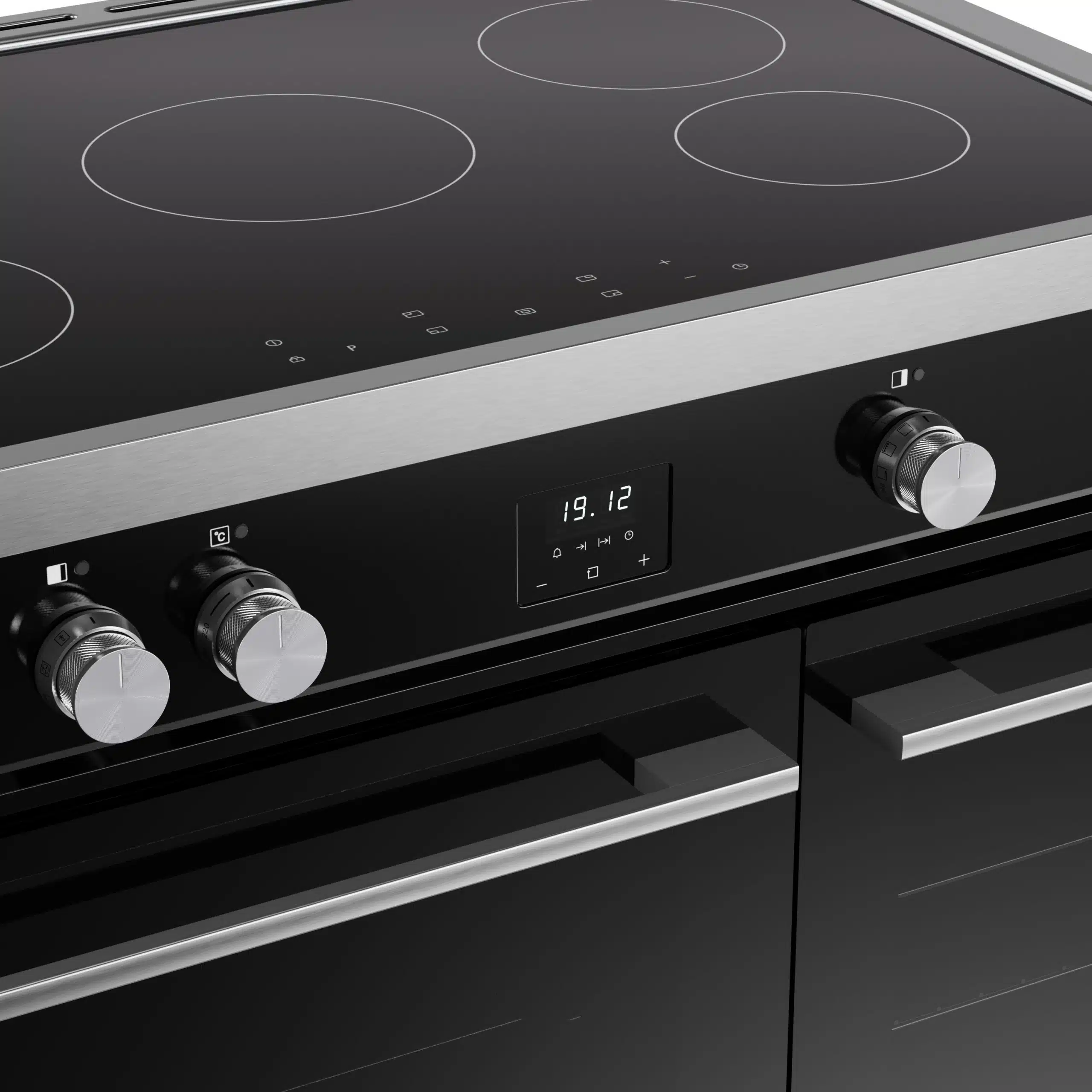 90 cm breed, energieklasse A / A, 5 kookzones, twee ovens, opberglade, elektronische timer, geforceerde koeling, aansluitwaarde 11,8 kW, afmeting fornuis (b x d x h) 900 x 600 x 880/935 mm.